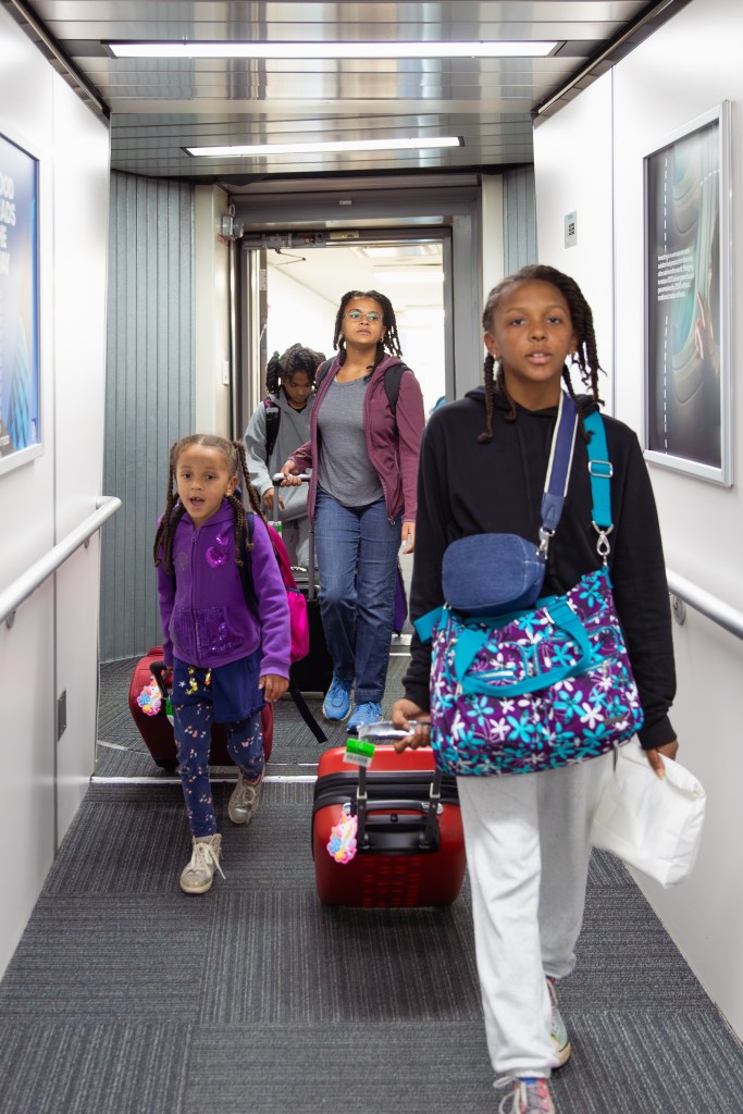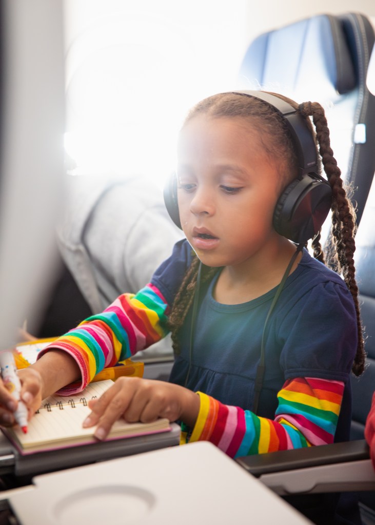 Many airlines allow you to bring a personal item like a purse or backpack, as well as a carry-on suitcase ,when boarding the plane. Items like card games, books, crayons, markers, and electronic devices, help time to go by quickly for your little ones. By packing these into thier personal bag (goes under the seat in front of them on the plane), they can grab them quickly during the flight.